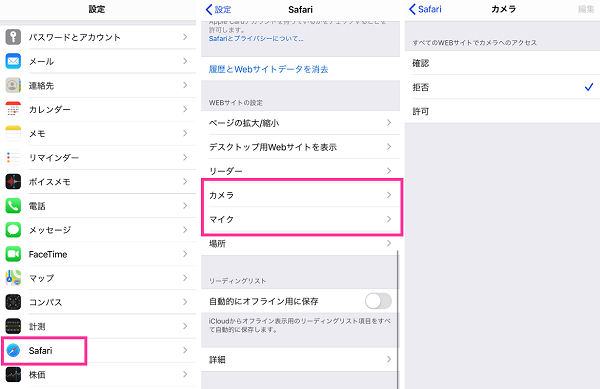 iOSデバイスでWEB面談を利用する際は、Safariの設定でカメラ、マイクの利用を許可してください。